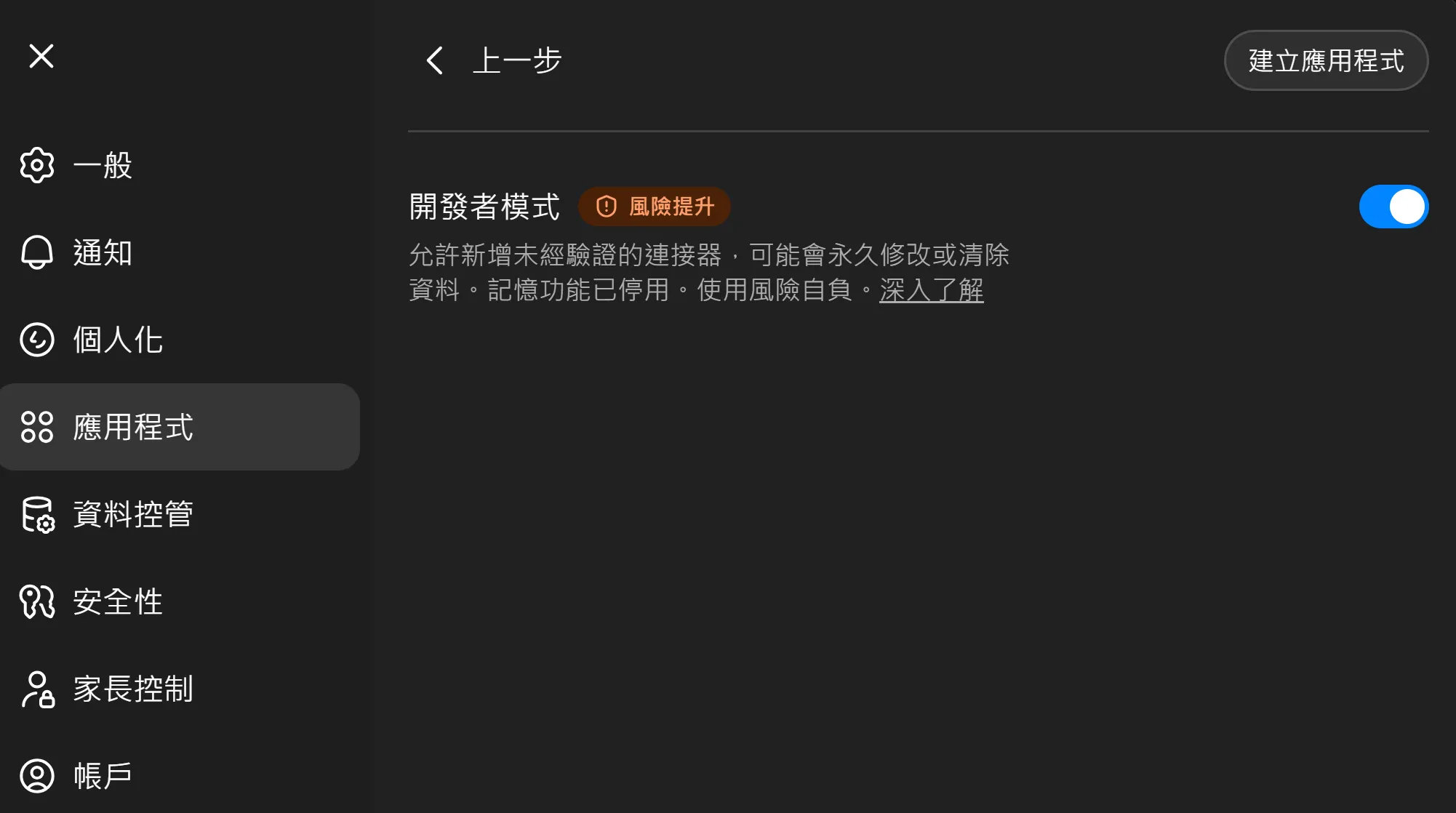3. 啟用「開發者模式」,並點選「建立應用程式」