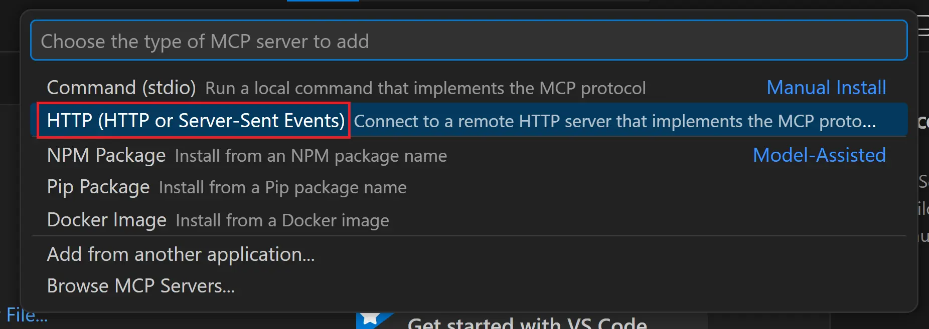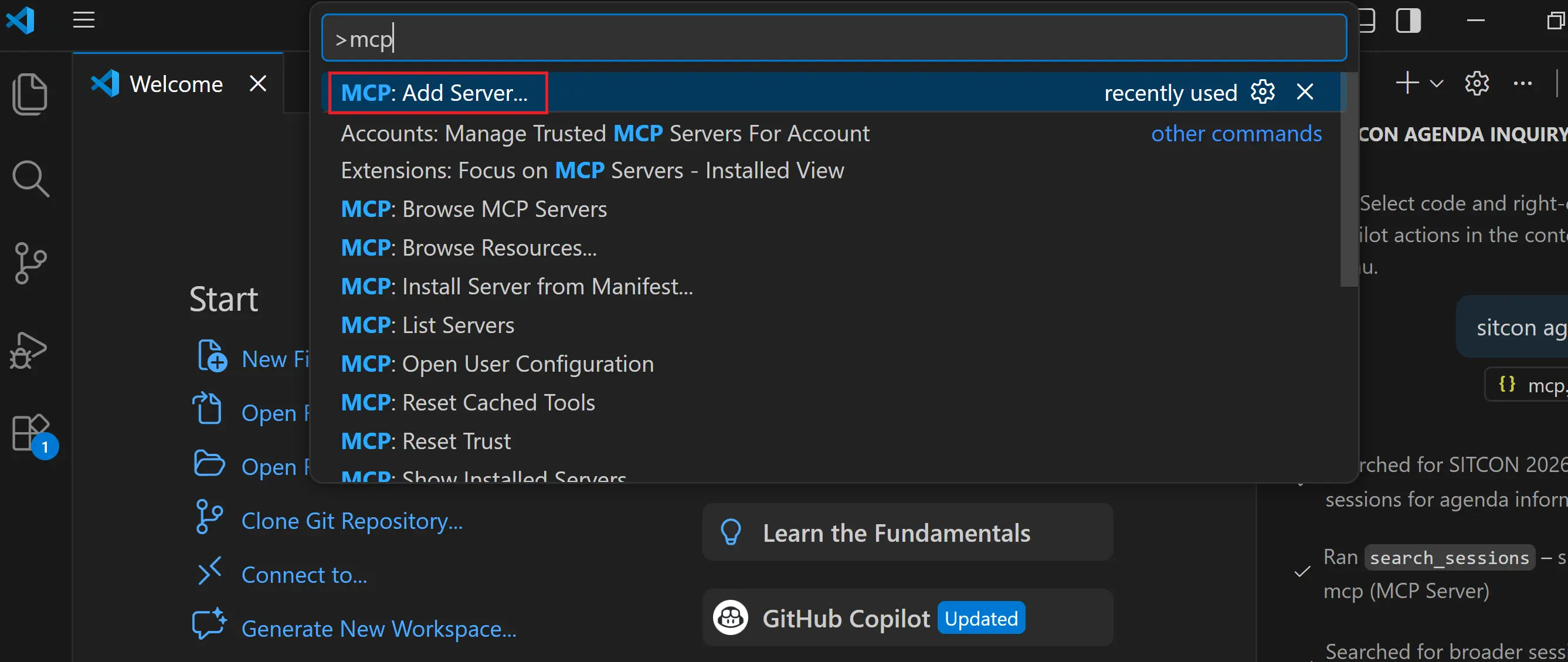 1. 開啟 VS Code,按「Ctrl+Shift+P」開啟指令面板,輸入「MCP」,選擇「MCP: Add server」