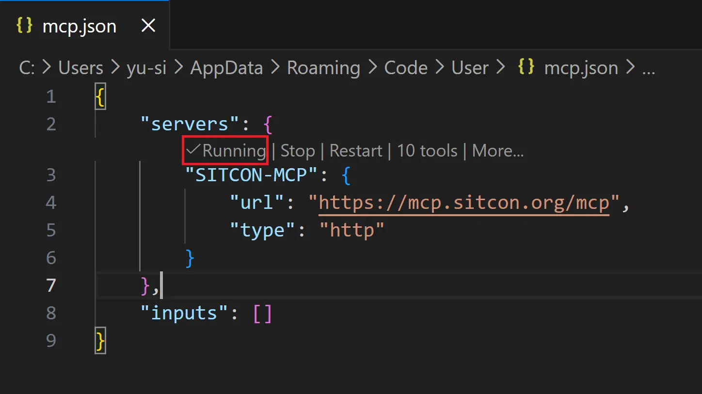 5. 看到建立的 mcp.json 檔案,並顯示Running,就代表成功了!