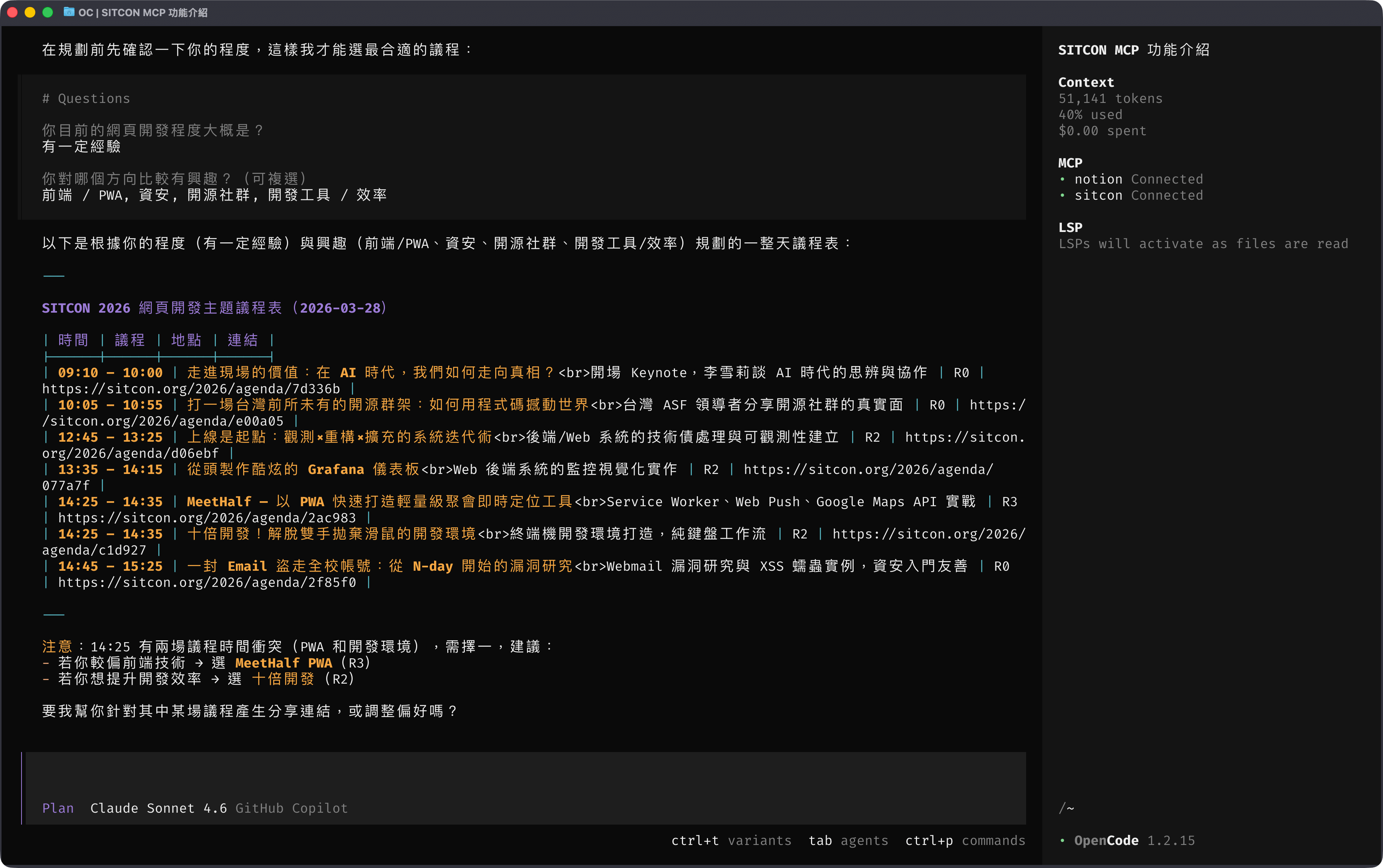 OpenCode 會自動載入設定並連線至 SITCON MCP Server,你可以在對話中直接使用相關工具。